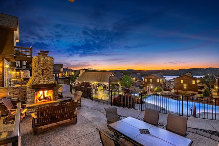 Tapasztalja meg a tóparti luxust a legjobb formájában! Pihenj a tágas nappaliban, amely lenyűgöző, hornyos fa mennyezettel, 8 méteres, folyókövekből épült kandallóval és a Table Rock-tóra és a medencére néző, padlótól a mennyezetig érő ablakokkal büszkélkedhet. A két felső szinten található master lakosztály mindegyikében king méretű ágy és saját fürdőszoba található. A futonnal és tévével felszerelt hangulatos loft nagyszerű a gyerekeknek. A főszinten két további hálószoba található (queen + teljes/queen emeletes ágy), közös Jack-and-Jill fürdővel. Lépj ki a saját teraszodra, és gyönyörködj a kilátásban, vagy készíts pillecukrot a hangulatos kőkandallón – a nyársat is megtalálod!