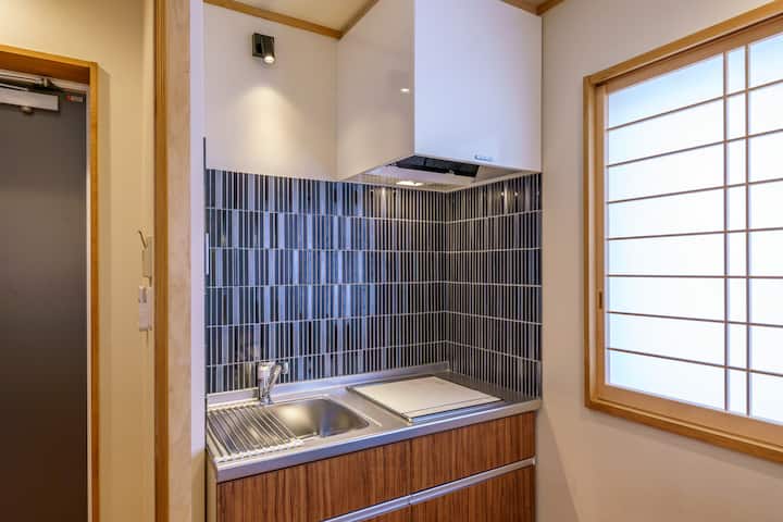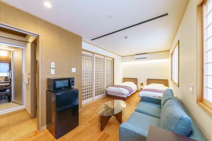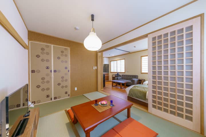 A belső tér nyugodt színű, japán stílusú tatamiszobák és nyugati stílusú szobák kombinációjával, így tökéletes családok és barátok számára.