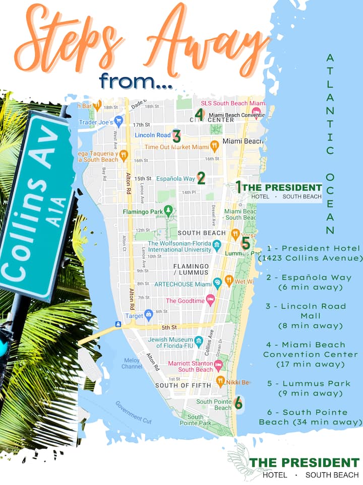 A President Hotel ideális helyen, az ikonikus Collins Avenue-n található, mindössze néhány lépésre a világhírű Miami Beach-től. Kiváló elhelyezkedésünknek köszönhetően sétatávolságra vagy South Beach legjobb látnivalóihoz, köztük a Lincoln Road Mallhoz, az Española Wayhez és sok máshoz.