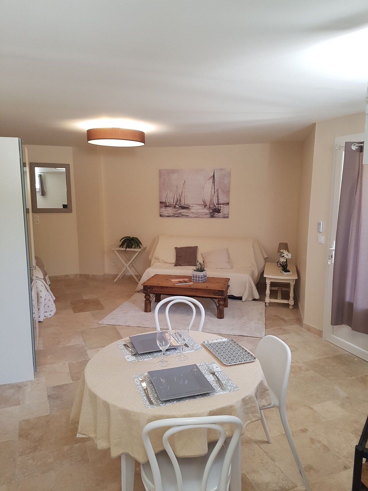 Draguignan magasságában, önálló lakás, amely a következőkből áll: - Nappali (TV, dohányzóasztal, kanapé) - Teljesen felszerelt konyhasarok (mikrohullámú sütő, főzőlap, hűtőszekrény, mosogató, 4 személyes edények, kávéfőző, vízforraló, kenyérpirító, ágynemű), ventilátorok. - Hálószoba ággyal 140 és szekrény tároló és szekrény. Esernyőágy. - Zuhanyzó, WC, hajszárító, törölköző. - Zárt parkoló. - Saját terasz kerti bútor, nyugi, plancha.