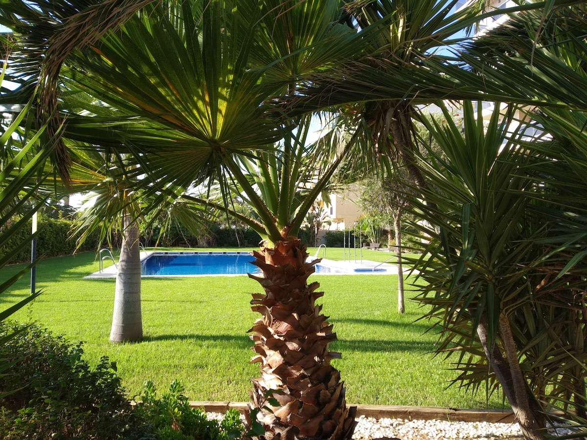 Csodálatos apartman, hogy élvezze a néhány nap pihenést és kikapcsolódást mellett Cabo de Gata és strandjai. A golfpálya mellett és egy rövid sétára a strandtól. Napozz a ház két teraszának/kertjének egyikén. Két hálószobája van, a fő fürdőszobával, teljesen felszerelt konyhával és egy nappalival, amely közvetlen hozzáférést biztosít a kerthez. A közös medencét közvetlenül a fő teraszról/kertről érheted el. Privát parkolóhely. 600 MB-os Wi-Fi, NETFLIX, légkondicionáló.