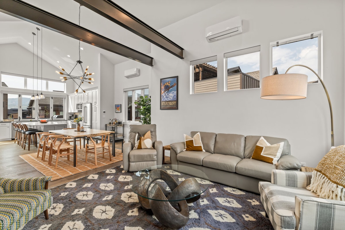 Modern mountain chalet with 25 ft ceilings, ski hill views, and an easy 4-block walk to the gondola. Enjoy light-filled spaces, a chef-ready kitchen, and the free shuttle just 50 ft away. Start your day with coffee on the deck, unwind under Aspen trees, or BBQ in warmer months with indoor-outdoor living. Designed for families, groups, and pets, to relax, gather, and explore Steamboat year-round, from skiing to summer adventures, dining, shopping, and local events. License #STR20230670