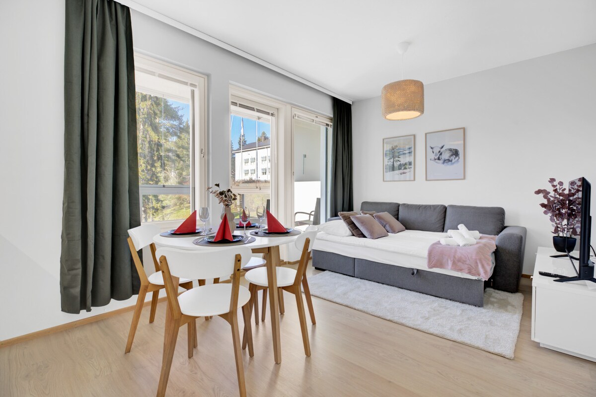 Teljesen felszerelt, modern lakás egy kellemes tartózkodáshoz Rovaniemi téli csodaországban. ❆ 56 m² -es, stílusos lakás ❆ Minden modern létesítmény és teljesen berendezett konyha ❆ Saját erkély ❆ Ingyenes parkolás ❆ Nagyszerű elhelyezkedés a városközpont mellett. A szafari irodák, a városközponti éttermek, kávézók és üzletek mindössze 5 perc sétára találhatók A Santa 's Village❆ buszmegállója mindössze 4 perc sétára található ❆ Egy gyönyörű folyóparti séta mellett