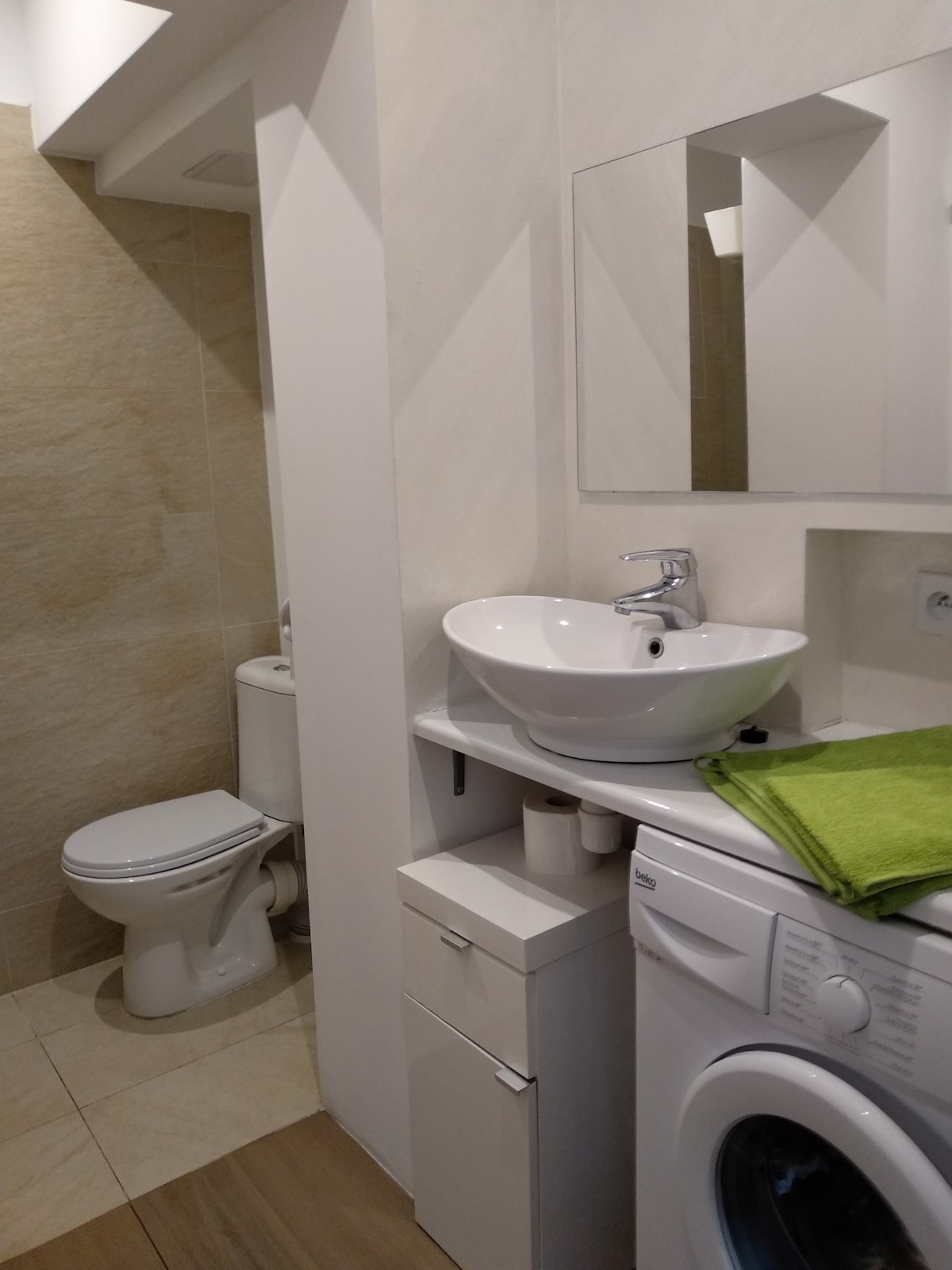 Jól megvilágított lakás a legfelső (4.) emeleten, nagy erkély, nappali, hálószoba, nyitott konyha és fürdőszoba. Mosogatógép, hűtőszekrény fagyasztóval, indukciós tűzhely és mosógép. Az épületben lift és kaputelefon található. Központi fűtés vezérlővel és vízlágyító állomásról származó folyó vízzel. A padlókon csempe és panel. Az előszobában egy kommandó típusú szekrény. A hálószobában 140 x 200 cm-es ágy. Munkaasztal. Külső redőnyök (kézi és elektromos).