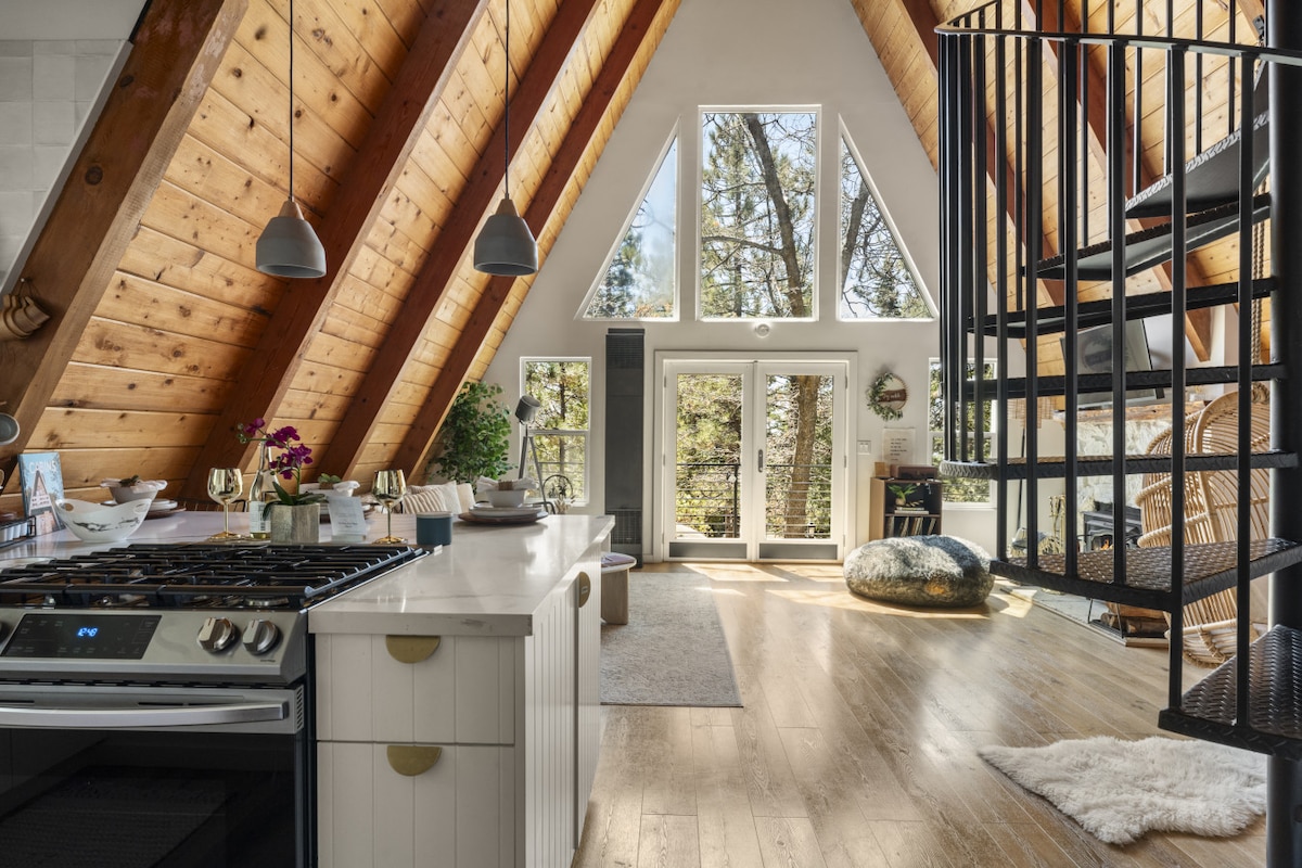 As you walk up stairs passing native boulders and trees, you see an A-frame cabin in the woods begin to peek out, inviting you. Once upon the front deck, the large pane windows draw you into this spacious, high-ceiling, open-concept cabin. Inside, these same windows that drew you in, will encourage the same gazing now, except outwardly. Tastefully designed and relaxing, you may not want to leave, though Big Bear, and Lake Arrowhead all beckon within 30 mins drive... Welcome to The Scandia 🦌