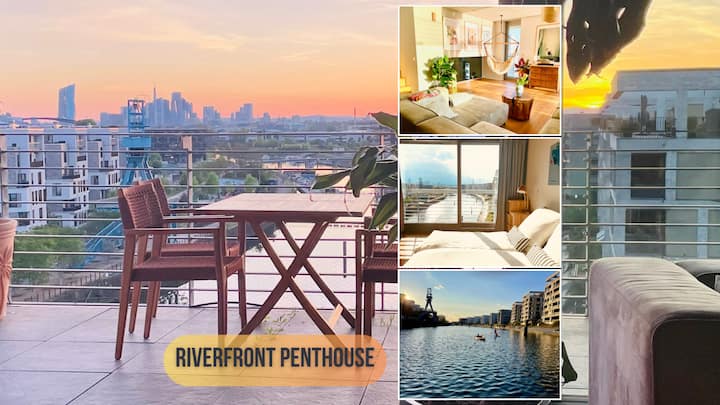 Modern penthouse kilátással a várossziluettre és parkolóval