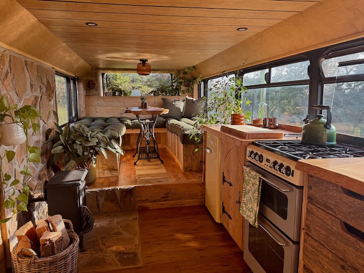 Hangulatos buszmenedék fatüzelésű pezsgőfürdővel és tűzhellyel