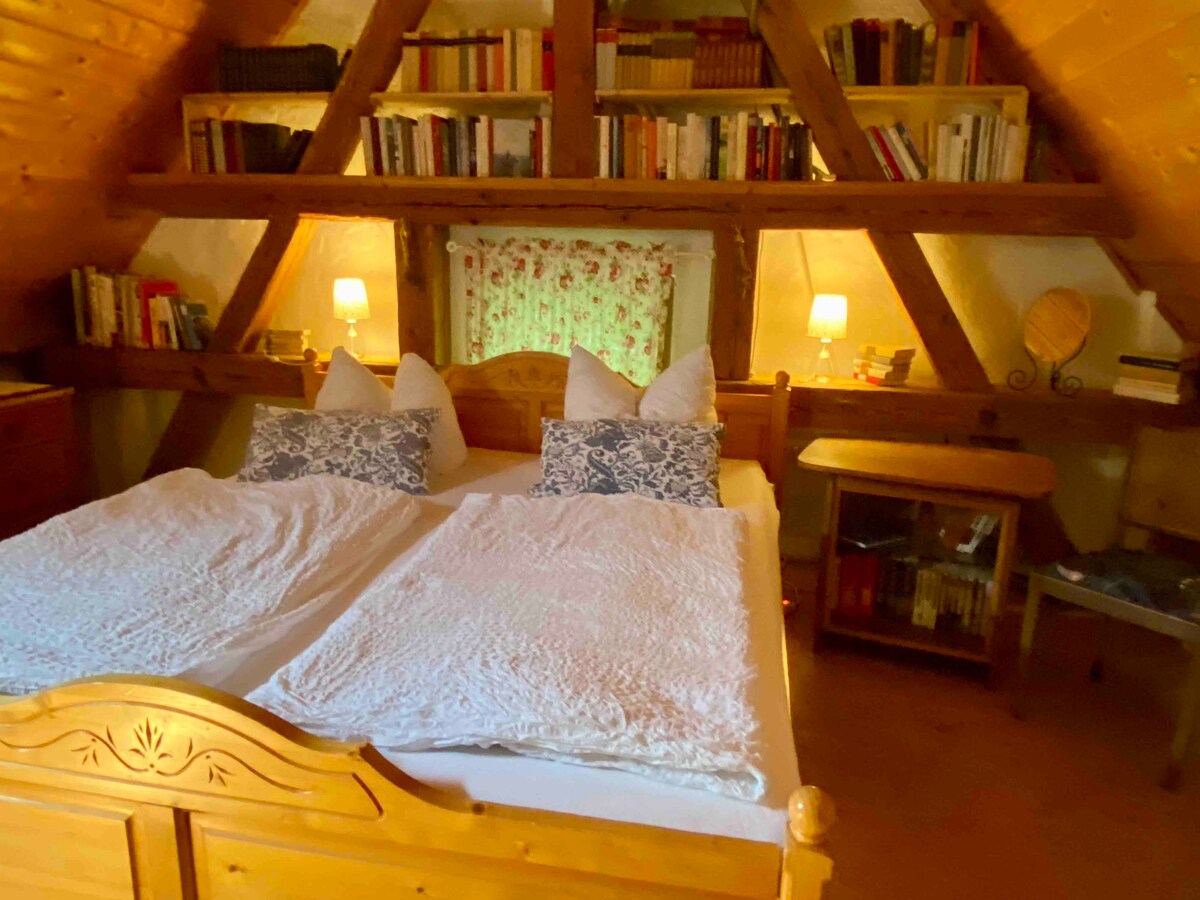 In einem liebevoll sanierten, ehemaligen Pferdestall von 1900 erwartet Euch eine gemütliche Ferienwohnung mitten im Grünen. Den großen Garten könnt Ihr sehr gern nutzen. Die Ferienwohnung reicht über zwei Etagen. Im Erdgeschoss befindet sich ein großes Schlafzimmer mit Doppel- und Kinderbett. Im oberen Geschoss findet Ihr den großzügigen Wohn- und Essbereich, ein weiteres Schlafzimmer mit zwei Einzelbetten, die Küche sowie das Bad. Zwei weitere Matratzen befinden sich im gemütlichen Spitzboden.
