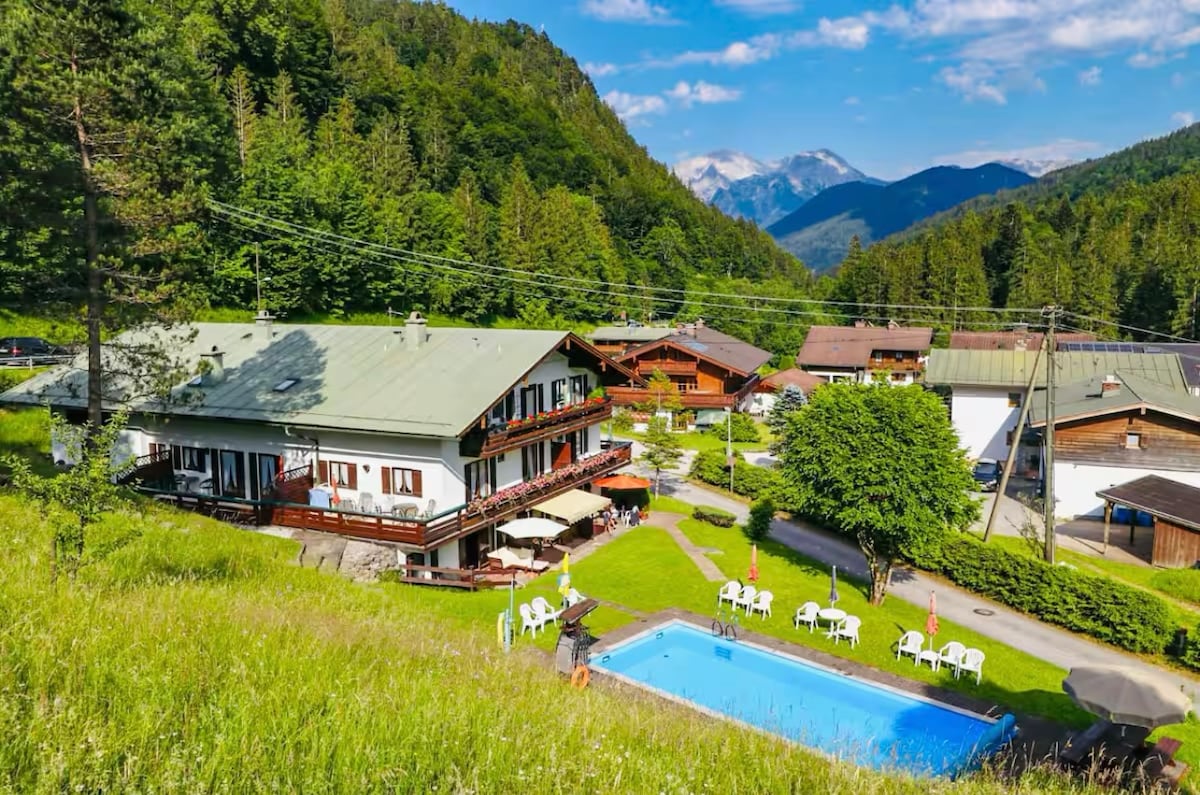 Sunny 65 m² holiday apartment in a prime location with breathtaking views of the Berchtesgaden Alps. The apartment offers a living room with a cosy sofa and TV, a fully equipped kitchen with dining area, a large bathroom with bathtub/shower, and a separate toilet. The bedroom features a double bed made of two single mattresses. Relax in the garden. Free parking and a guest card with local discounts are included – ideal for nature lovers and guests seeking peace and quiet.