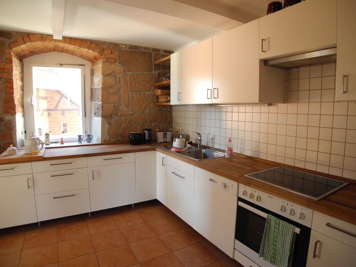Tágas nyaraló/farm a türingiai erdőben Rudolstadt és Leuchtenburg közelében - A háromoldalas farm egy felújított parasztházból, egy külön melléképületből (két külön lakással) és egy pajtából áll. A parasztház 2 emeletes, és összesen 11 fő befogadására alkalmas. A földszinten található a nappali és étkező, konyha és külön WC. Az emeleten 2 zuhanyzó, 2 WC és 7 hálószoba található (összesen 11+2 hálóhely).
