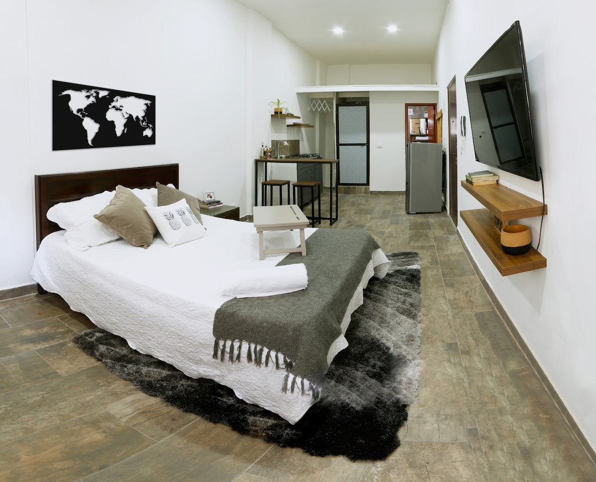 Modern apartman az Hotel Urban Studios 17. emeletén, csodálatos kilátással Medellinre. Csak 10 perc sétára a Tesoro Malltól, és közel a legjobb éjszakai élethez, mégis egy nyugodt és kellemes környéken. Kényelmes king méretű ággyal, teljesen felszerelt konyhával, légkondicionálóval, mosógéppel, gázszárítóval, gyors Wi-Fi-vel és az Al Alma étteremhez való hozzáféréssel, szobaszervizzel. Az épületben medence, pezsgőfürdő, edzőterem, munkaszobák és nonstop biztonsági szolgálat található.