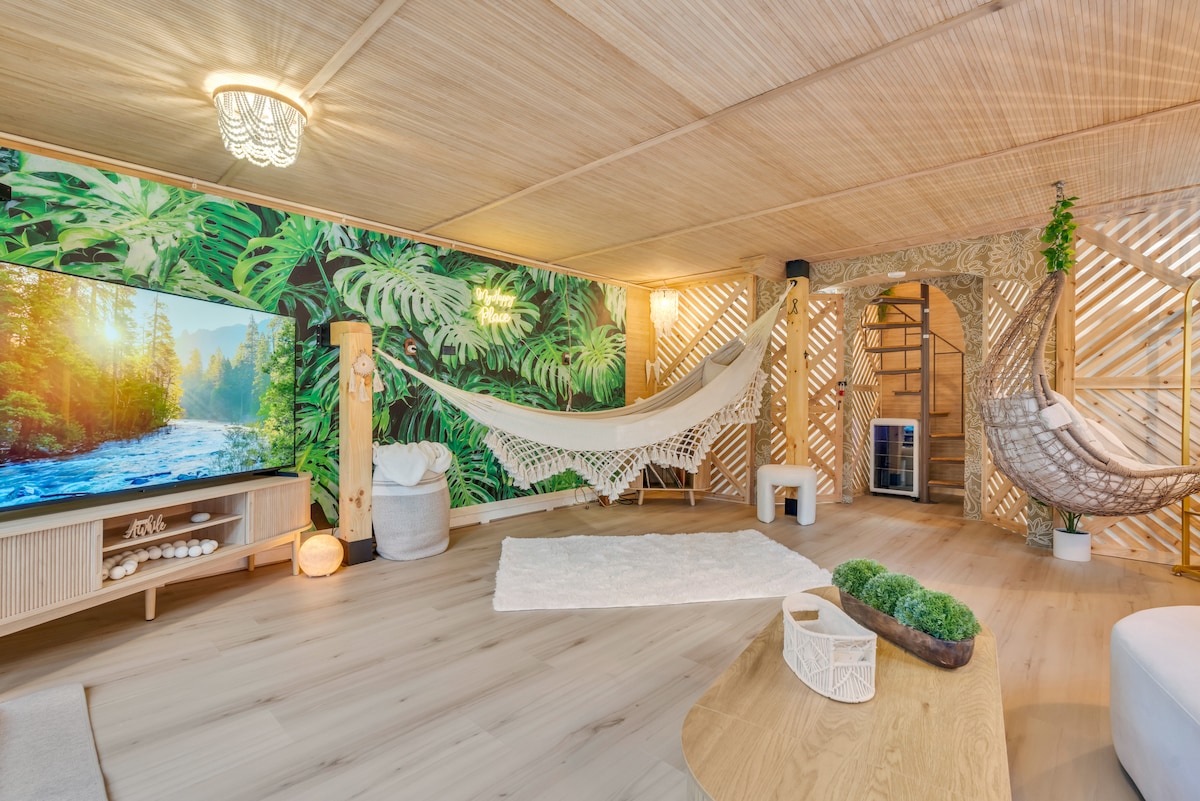The Lotus is your zen home away from home. Enjoy peace and tranquility on your private back deck, the amazing salt water hot tub (exclusively use) new sauna, heated seasonal outdoor shower, deep bathtub (showering is tricky for people taller then 5'5)with bluetooth speaker.Comfortable king size bed with European bedding and a single fold out foam mattress on the 1st floor, that was just finished as another relax area, with 70" TV, record player, hammock & hanging chair.