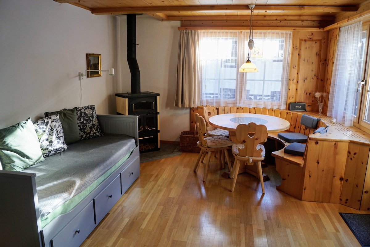 Entspanne dich in diesem einmaligen Rifugio. Im Jahre 2020 total sanierte 2 1/2- Zimmerwohnung, deren Interior Design komplett neu gestaltet wurde. Als Loft mit edelsten Materialien (Valser Granit, Schlossparkett, viel Altholz, freistehende Wanne, Eisenkamin auf zwei Seiten geöffnet, Designarmaturen) ausgebaut. Mit geschütztem Gartensitzplatz und Garten. Sonnige, ruhige Lage. Eigener Hauseingang, Sauna im Nebengebäude. Ski in, ski out oder Skibus in drei Minuten erreichbar.