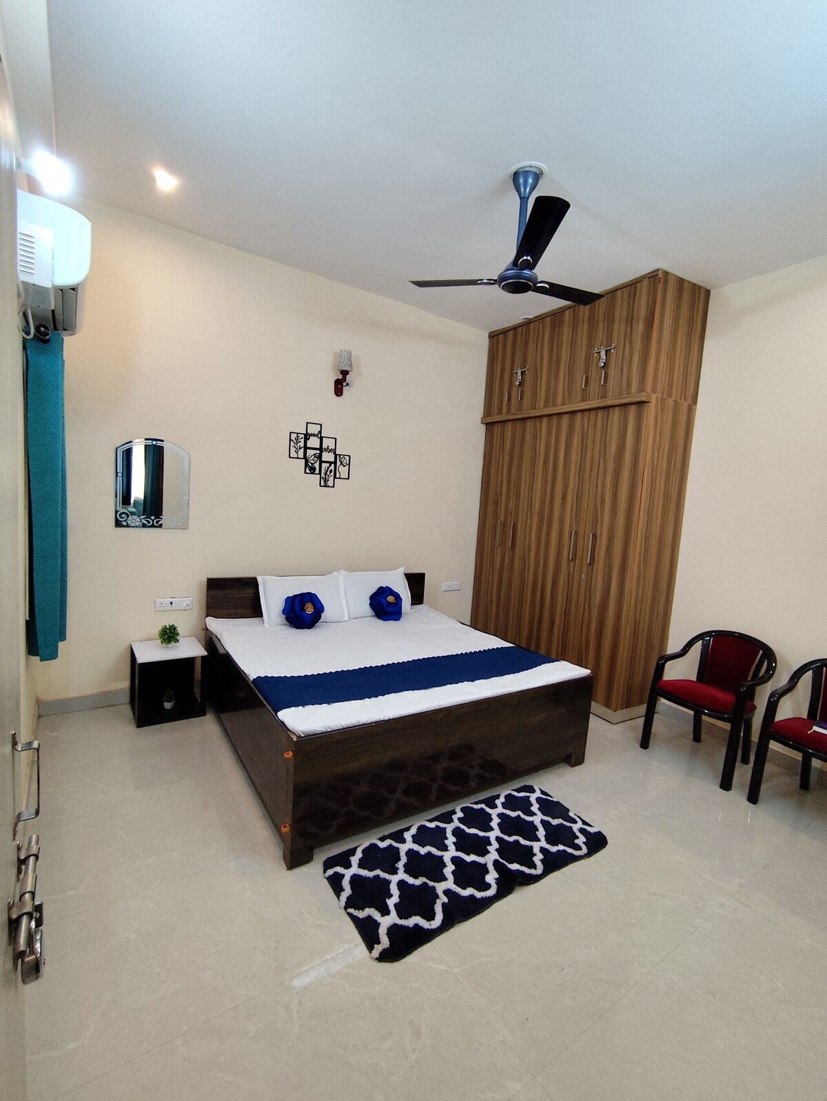 • Spacious 2BHK on the third floor • 1 double bed, 2 single beds & 2 sofa-cum beds • Comfortably accommodates small & large groups • 3 air-conditioned rooms for full comfort • 3 modern washrooms with 24/7 hot water • Fully equipped modular kitchen for easy home cooking • In-built Bluetooth sound system • Private open balcony for morning tea & evening relaxation • Bright, airy living hall with ample seating space • Peaceful, secure, and well-maintained building environment