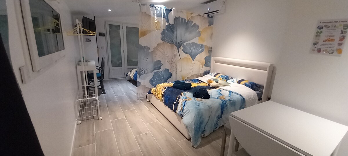 A Ginkgo stúdió azoknak a családoknak vagy barátoknak készült, akik együtt szeretnének utazni, mert a szálláshelyünk autóval 5 percre van a repülőtértől, 40 percre gyalog Ágyakkal, törölközőkkel, zuhanyzós termékkel... Reptéri parkolást 45 €/hét áron kínálunk De nyilvánvalóan, ha egy hetet szeretnél eltölteni a stúdióban, ne aggódj! Rengeteg látnivaló van Nantes-ban és környékén... És különösen ne habozz, ha bármilyen kérdésed van, menj a lydie szobába