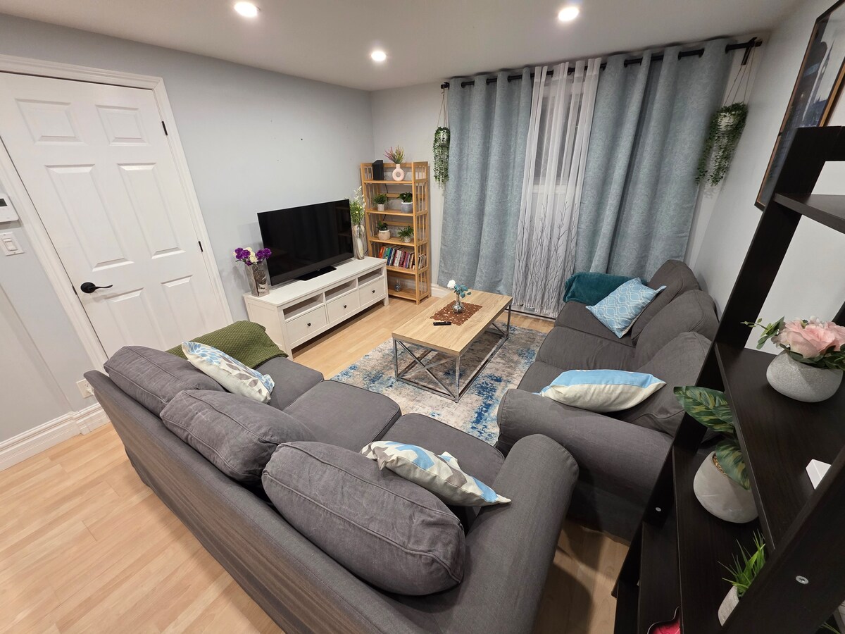 Menekülj Montrealba egy stílusos lakosztályba! A képeken semmi sincs megosztva másokkal 🔐 + A saját bejáratod🚪 Pihenj a tágas nappaliban az intelligens nagy képernyősön 📺 Alvás egy kényelmes queen méretű ágyban 🛏️ Minden az alagsori lakosztályban egy csendes utcában található 💤 Autóval 🚙 15 percre Montréal belvárosától 6 percre a REM Panama állomástól és a Mall Champlain-től 5 perc a DIX30 bevásárlóközpontig Gyalog🚶🏻🚶🏻♀️ 12 perces élelmiszerbolt Ingyenes utcai parkolás 🅿️ Mosógép/szárítógép mellékelve 🧺 Változatos étkezési 🍽️ lehetőségek percekre. Foglald le még ma az elvonulásodat : )