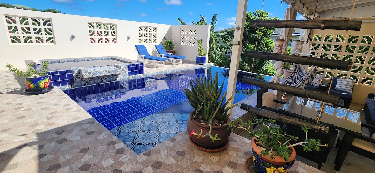 Just 7 minutes’ drive from beaches & the lively Frigate Bay Strip, this spacious 1-bedroom retreat blends convenience with tranquility. Located in a quiet residential area, it’s ideal for guests seeking a relaxing stay near top dining and nightlife. Enjoy your private saltwater pool & outdoor kitchen/BBQ (8 AM–8 PM), plus a fully equipped home with A/C, kitchen, washer/dryer, workspace, & pull-out sofa bed. Unwind on your breezy balcony surrounded by tropical palms and a calm Caribbean vibe.🌴