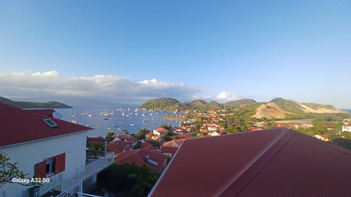 Ez a Terre-de-Hautban, egy dombon található barátságos és kényelmes lakás a házunk földszintjén található, zöld és békés környezetben. Ideális 2 fő számára. 1 légkondicionált hálószoba, nappali kanapéval, felszerelt konyha, fürdőszoba, terasz csodálatos kilátással a tengerre. A kikötőtől 10 percre található. Háztartási textíliát biztosítunk.