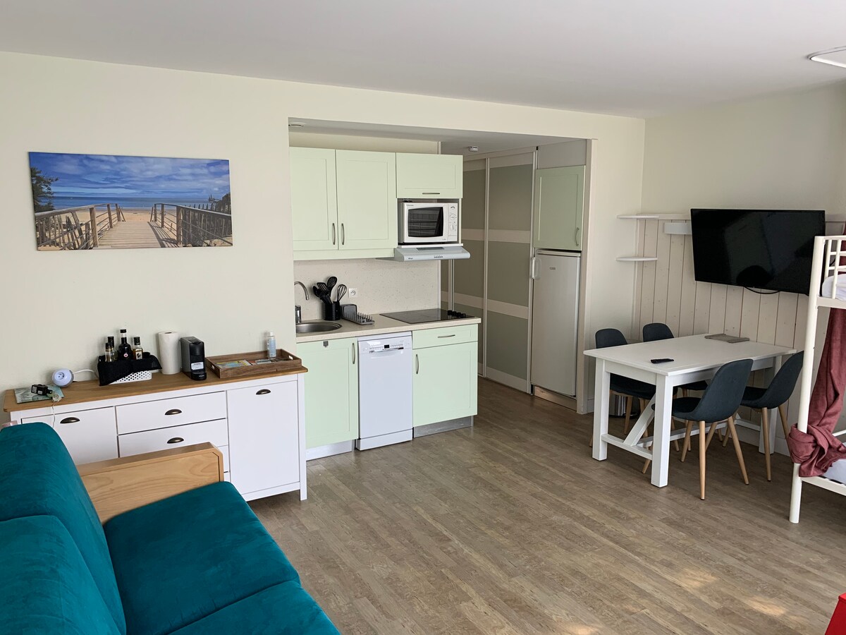 Studio classé 3* (33m2) tout confort à 5 min à pieds du port, dans résidence calme. Canapé lit 160 et lits superposés 90/190 pour famille avec 1ou2 enfants ou 3 adultes. Un bout de jardin avec mobilier. Piscine chauffée, sauna et hammam ouverts toute l'année. Linge NON compris (PAS de torchons, tapis de bain, draps, serviettes), location payante sur demande. Parking gratuit sur place (selon disponibilité) Un montant de 40 euros pour le ménage est inclus dans le prix.