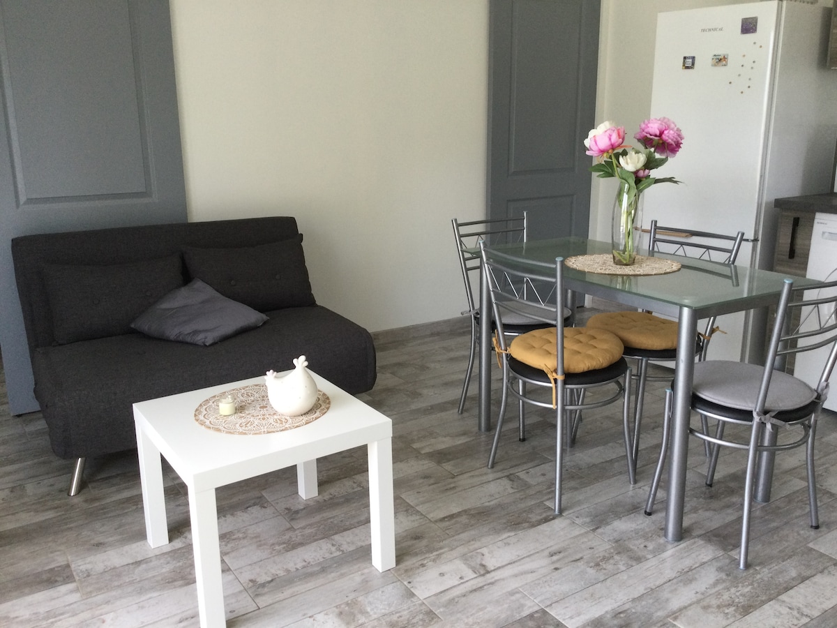 Szia! Örömmel ajánlom fel neked ezt a bútorozott stúdiót, amely egy kert szívében található, és elkerített belvárosi: - egy szint - független hozzáférés - teljesen csempézve a maximális atkavédelem és higiénia érdekében - légkondicionált - csendes - Privát és zárt parkoló - 1300 méter a fürdőtől - Fürdőszoba zuhanyzóval (ágynemű biztosított) - 160 cm x 200 cm ágy (érkezéskor bevetett ágy) - Teljesen felszerelt konyha (mosogatógép) - privát terasz Üdvözlettel: André