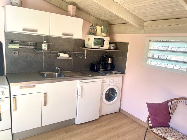Nous louons un studio indépendant, situé dans notre jardin. Vous êtes également les bienvenus sur la terrasse couverte de notre maison, qui abrite une table ainsi qu’un salon d’extérieur. Vous avec libre accès à notre piscine (non chauffée) et ses transats ainsi qu’à l’ensemble du jardin. C'est un endroit idéal pour profiter de la vue sur la mer, ou du coucher du soleil, au calme, et sans vis-à-vis !
