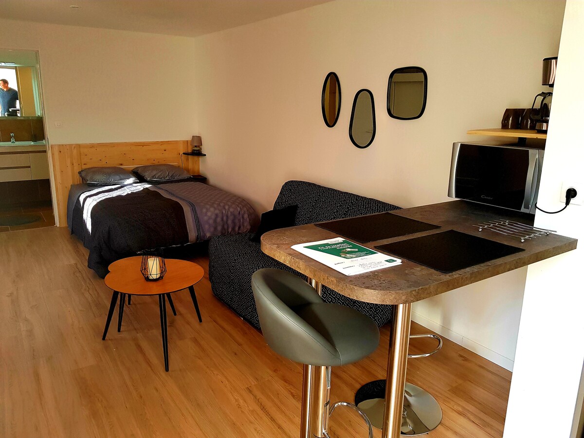 Le Cocon de la Villa Ola Bájos hálószoba kétszemélyes ággyal, felszerelt konyhasarokkal és fürdőszobával. Kis bónusz: privát terasz délre, ideális a szabadtéri étkezőterület élvezetéhez. 📍Helyszín: • Egy csendes, egyirányú utcában található. • Mindössze 15 perc sétára Mont-de-Marsan belvárosától és Saint-Pierre-du-Mont falutól. • Az INSPE előtt és a következő helyen: az IUT közelében. 🚗 Kényelmes: Ingyenes parkolás a közelben. Igazi báb a kellemes tartózkodáshoz!