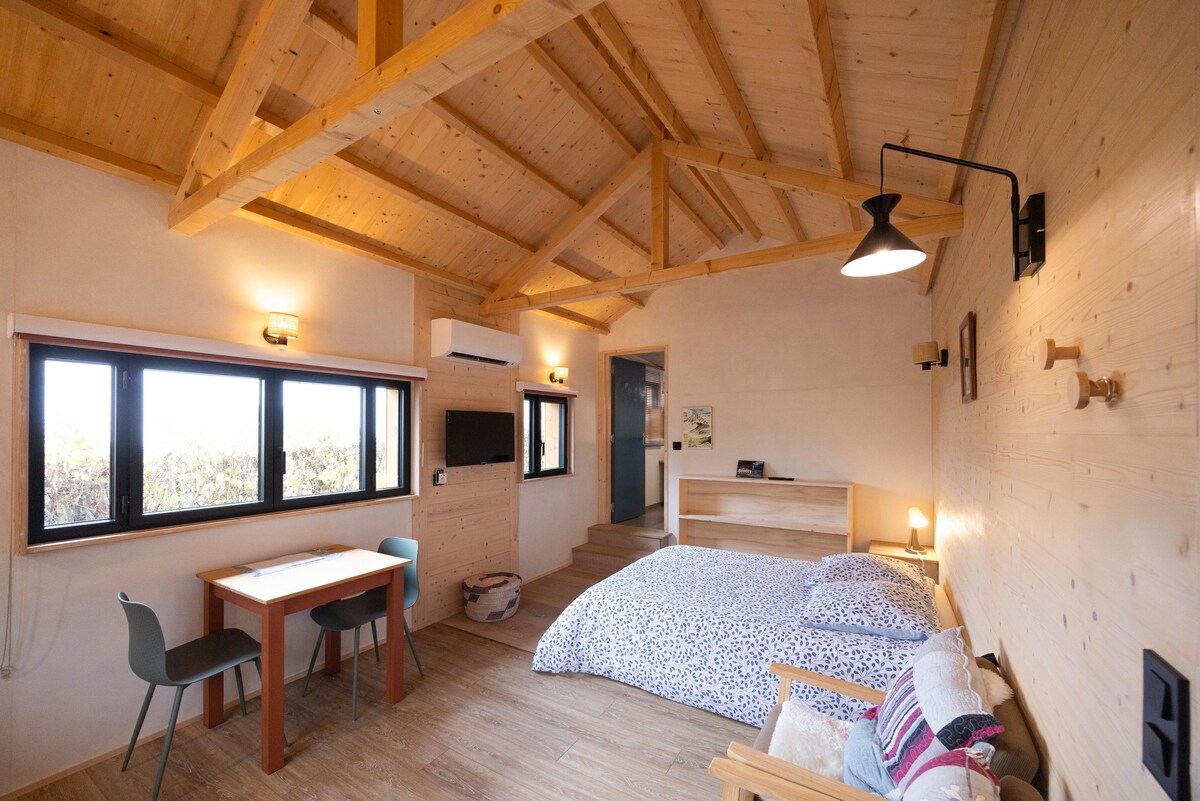 Grand T2 entièrement meublé dans une maison individuelle avec une entrée indépendante. Il dispose d'une grande pièce à vivre avec cuisine intégrée et coin salon (canapé lit) qui donne sur une grande terrasse en bois. Une chambre avec un lit en 160 donne accès à la salle de bain et au dressing. WC indépendant. Possibilité de lave linge pour les séjours de minimum 4 nuits. A noter que pour une réservation d'une seule nuit, nous ne fournissons le linge de maison que pour deux personnes.