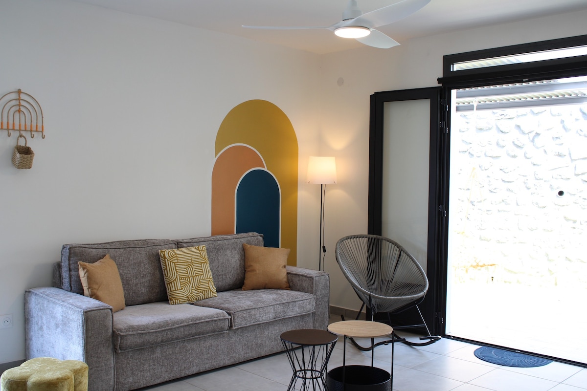 Üdvözlünk az otthonunkban, az otthonunk alját külön bejárattal adjuk ki. Kert (pavilon) és független szállás tőlünk. A Sainte Rose-i Bois Blanc negyedben található, közel a vízesések öböléhez, a lávaáramláshoz és a színes fából készült erdőhöz. Gyönyörű, teljesen felszerelt lakás egy hálószobával és egy kanapéval, nappalival, étkezővel, felszerelt konyhával, zuhanyzós fürdőszobával és WC-vel. Ágynemű és törölköző biztosított.