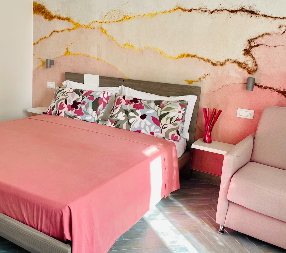 La camera deluxe è una camera full optional spaziosa e arredata con colori caldi stile shabby chic, una caratteristica molto apprezzata che attrae notevolmente gli amanti della cultura e della tradizione. Bagno privato in camera; non dovrai mai condividere il bagno con nessuno. Materasso matrimoniale comodo per garantirti tutto il comfort necessario per un pernottamento perfetto. Angolo colazione riservato; non farai mai colazione con estranei. Inoltre, hai a disposizione la macchina del caffè,.