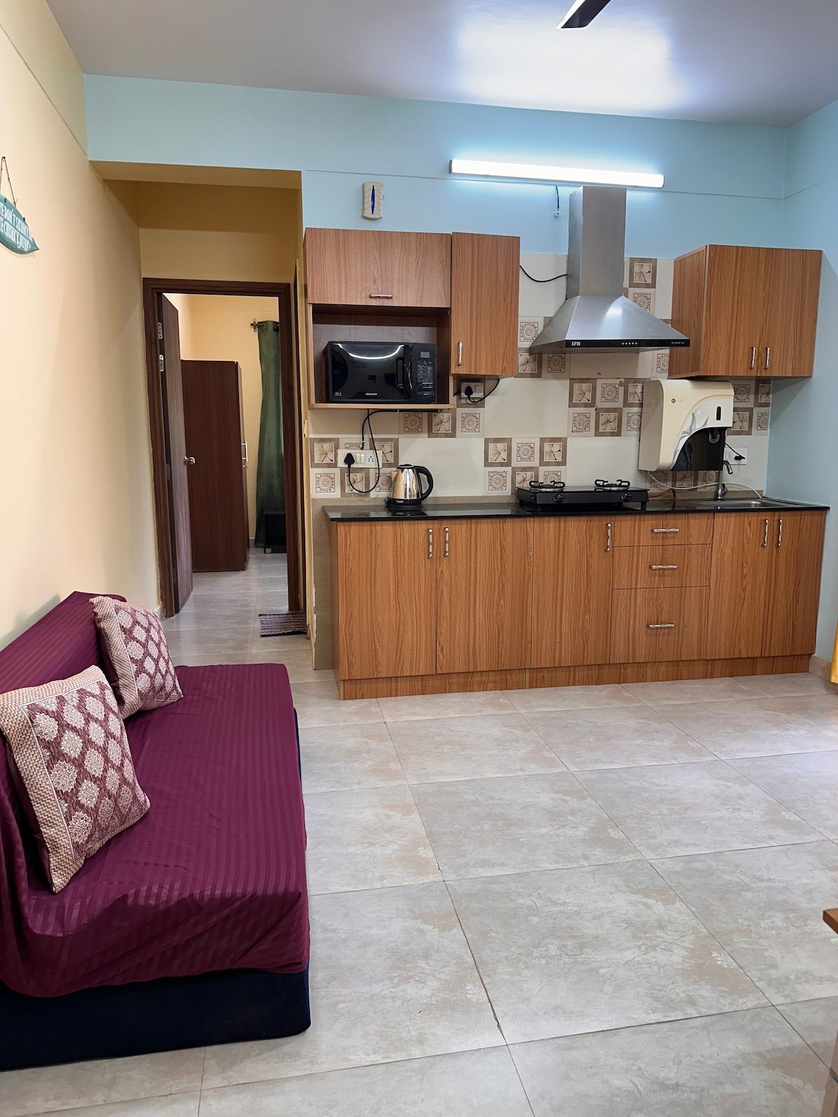 Welcome to Breezona – Your Calm Tropical Hideaway Near Candolim Tucked away just 15 minutes from Candolim Beach, Breezona is a beautifully designed 1BHK that blends boho charm with tropical serenity. With its soothing green tones, natural wood accents, and cozy minimal décor, this space invites you to unwind, breathe easy, and soak in Goa’s relaxed energy. Ideal For: Couples, solo travelers, or anyone who loves stylish stays and calm vibes. Come, let Breezona be your slice of paradise in Goa