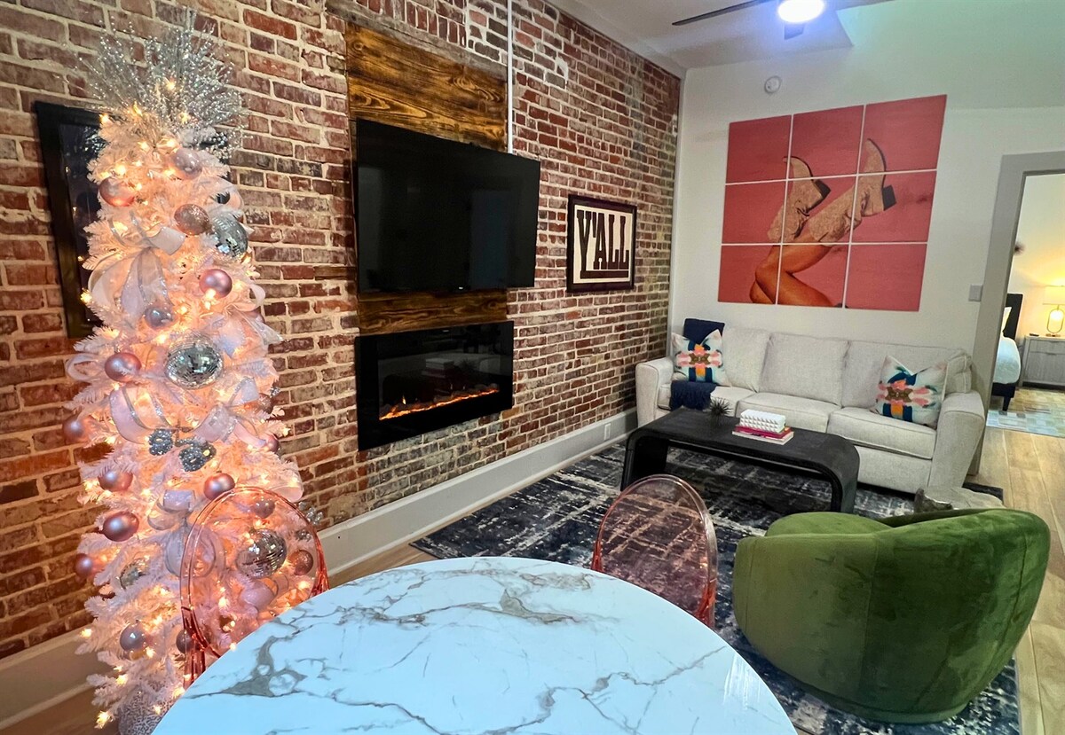 Disco Cowgirl is a vibrant 400 sqft loft in downtown Hot Springs, offering a king bed, queen sleeper sofa, fully equipped kitchen, and a sleek walk-in shower. With retro-inspired decor and exposed brick walls, this cozy retreat is perfect for couples or small groups. Located on Central Avenue, it’s steps away from Bathhouse Row, restaurants, and local attractions, making it the ideal base for exploring everything Hot Springs has to offer.