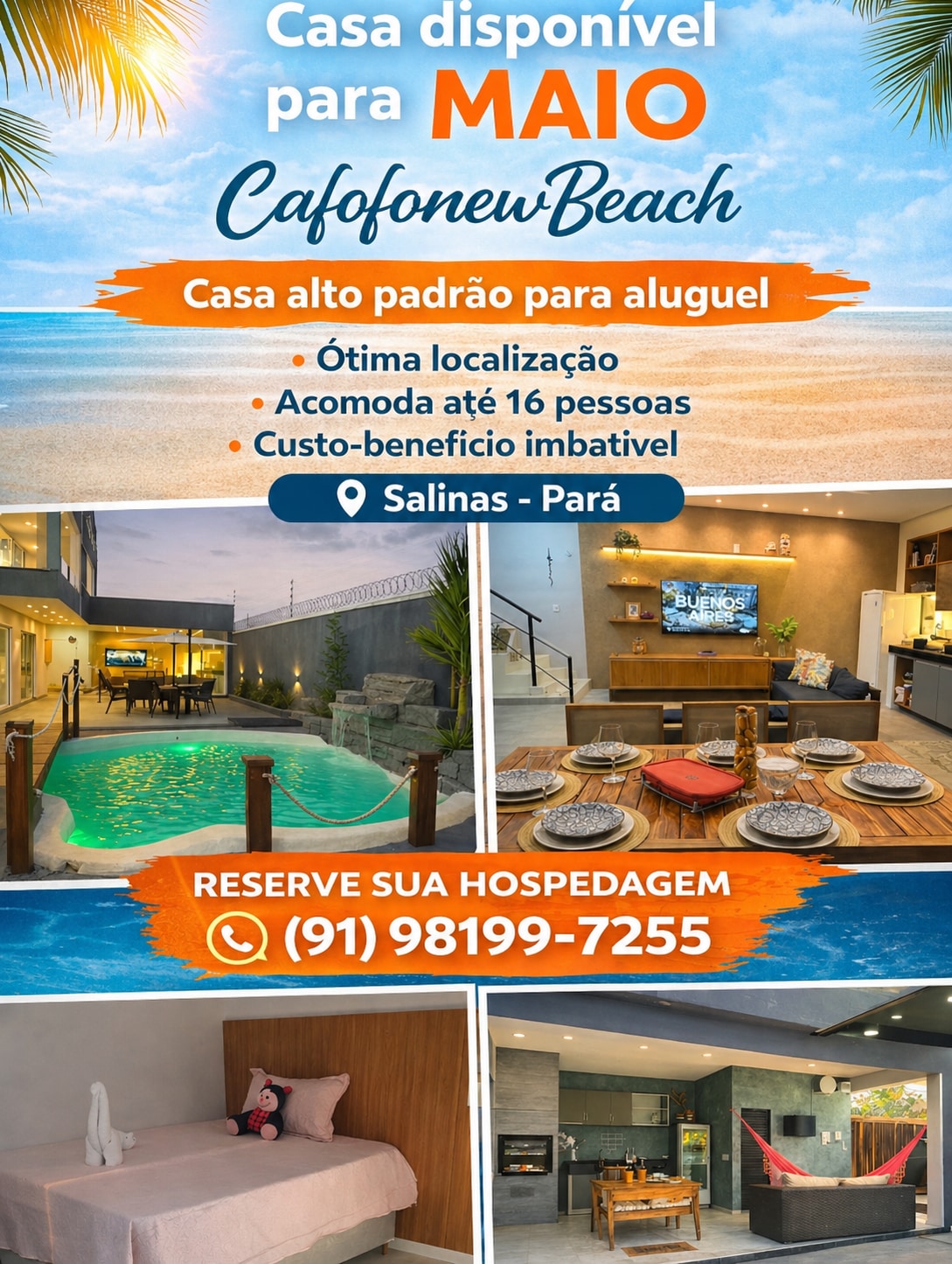 Casa de praia em condomínio fechado, com cerca elétrica, em frente à praia do Atalaia, na cidade de Salinópolis/PA. Três suítes climatizadas (uma delas com banheiro reversível), sofá cama e armadores de rede em todos os cômodos. Cozinha completa com geladeira, fogão, forno, micro-ondas, liquidificador, cafeteira, pratos, copos, pratos, talheres, panelas e demais utensílios. SKY e WI-FI. Condomínio em ambiente familiar, com piscina e churrasqueira e vaga interna de estacionamento.