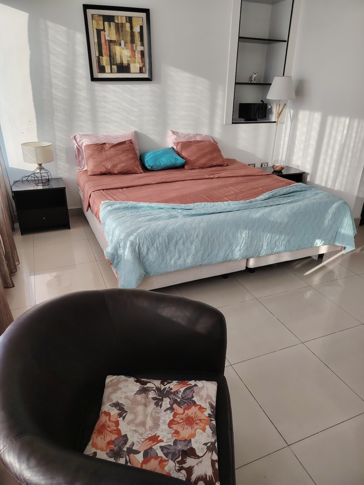 Modern, minimalista stílusú lakás Samborondónban, kiváltságos környéken, éjjel-nappal működő magánbiztonsági szolgálattal. Ideális családoknak vagy vezetőknek, akik kényelmet és nyugalmat keresnek. Közvetlenül az El Dorado Mall előtt. 3 hálószobája van, mindegyikben van tévé Netflix-szel és légkondicionáló. A nappaliban 65 hüvelykes tévé található. 100 Mbps sebességű internetkapcsolat is van, ami tökéletes a kényelmes munkavégzéshez és a praktikus, pihentető szálláshelyen eltöltött időhöz.