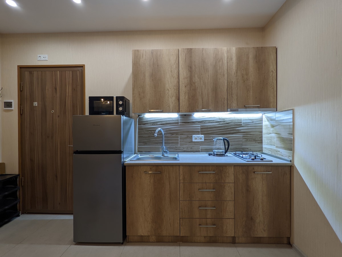●Park Residence complex 35 sq.m studio. Our Studio Triple Apartments offer Beds with comfortable 1 Queen+1 Sofa. ●The studio triple apartment also offers an ensuite bathroom with shower and toilet. ●Fully equipped kitchens make dining easy with full tea and coffee making facilities, fridge and freezer, microwave and washing machine. All cooking utensils and cutlery are supplied. ●Close to the apartments are supermarkets, pharmacies. ●The best holiday apartment in the center of Bakuriani.