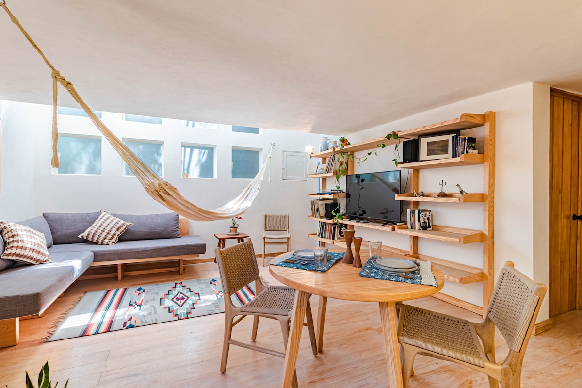 Ház egy hálószobával , gyönyörű japán kerttel. Kizárólag pároknak vagy pihenésre vágyóknak (nincs helyszín eseményeknek , videóknak , fényképekre szomjaznak) Földszinti ipari stílus, első és második szintű japán dizájn. teljesen új, teljesen felszerelt, luxuskivitelű. A szálláshely készen áll a számodra. A szálláshely előtt (utca ) parkolunk. Egyedülálló élmény San Angel szívében. Három háztömbnyire a San Angelin étteremtől.