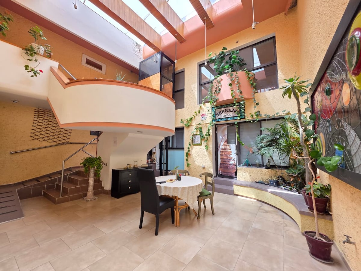 Casa Dos Cuervos Querétaro belvárosában. Élvezd az egyedi élményt a lakosztályunkban, amelyet egy belsőépítészeti stúdió tervezett. Franciaággyal, légkondicionálóval, felszerelt teakonyhával és önálló fürdőszobával rendelkezik. Az emeleten található egy tágas lakosztály king-size ággyal, légkondicionálóval, TV-vel és otthoni irodaterülettel. Mindig tiszta és készen áll arra, hogy üdvözöljön. Tapasztald meg Querétaro városát, mint egy helyi egy exkluzív és kényelmes helyen.