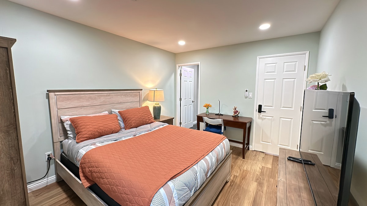 Welcome to your stylish and convenient studio apartment nestled in South El Monte This cozy space offers minimalistic living with a touch of comfort, perfect for those seeking a hassle-free lifestyle. Key Features: Kitchenette: Fully equipped with various appliances and some ingredients for simple meals. Bedroom Area: Private and inviting, with a queen-sized bed and nightstands for your convenience. Bathroom: Spacious and peaceful, packed with toiletries and an LED Mirror great for selfies