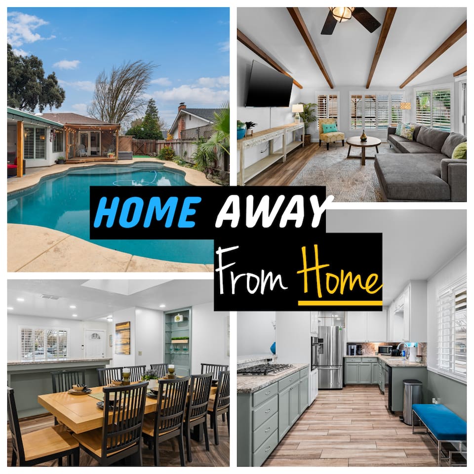 Have fun with the whole family at our stylish place. Our beautiful home features 2 bedrooms, 1 full bath, 1 queen size bed, 1 full size bed, 1 twin size bed and a sofa bed, and 2 living space, one with a fireplace with a view to our peaceful backyard with a pool to enjoy your morning & evenings. The backyard has a bar with outdoor lounge area. Updated kitchen with washer & dryer. Located by Oak Grove Park and 5 minutes to the freeway and shopping centers.