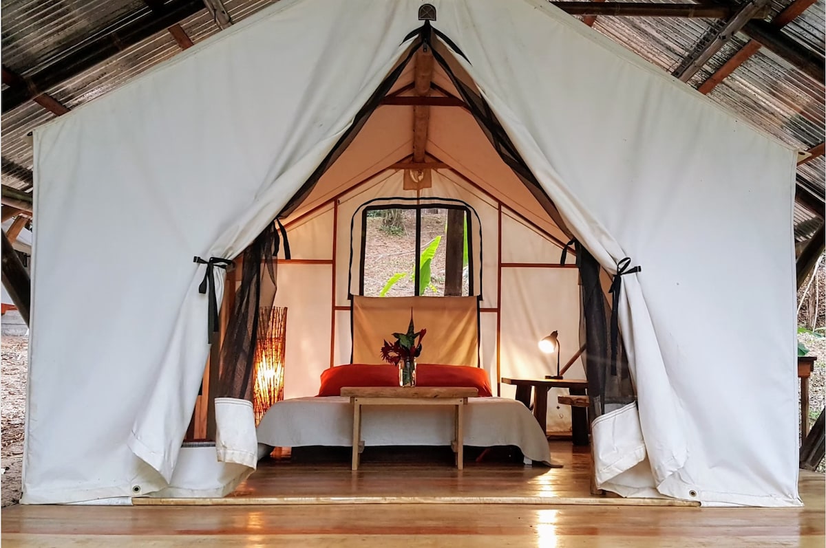 Our Glamping Tent is perfect for those wanting to enjoy a more luxurious, comfortable camping experience in the jungle! Nourish yourself with the elements & sounds of the jungle & a breath-taking view of the mountains. Space includes a double-size bed, private bathroom and patio with hammock. Breakfast included. Kitchen is for staff use only.