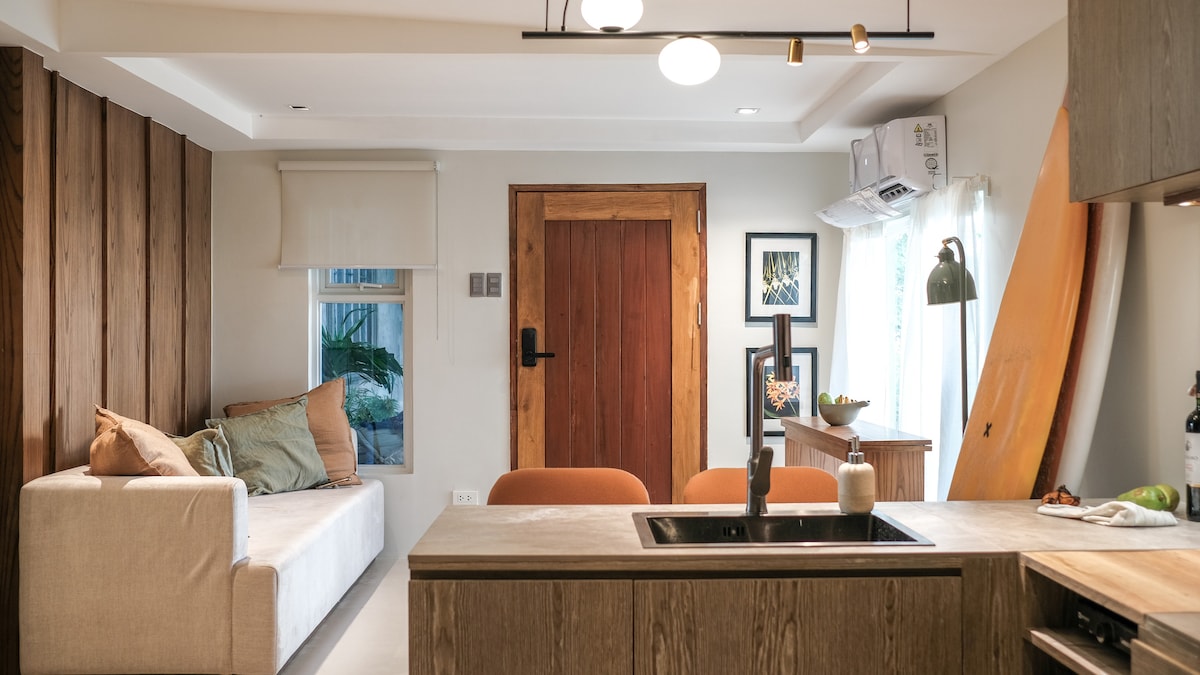 Modern 3BR house in San Juan, 5 min walk to beach. Architect-designed with full kitchen guests rave about: island bench, full appliances, everything to cook properly. "Met my OCD standards, every corner immaculate." Natural tones, high ceilings, beautifully modern yet cozy. Sleeps 6, AC throughout, fast WiFi, outdoor deck, gated parking. Quiet street near Taaw Beach Club. Not a typical surf rental. A properly designed home that happens to be near the beach.