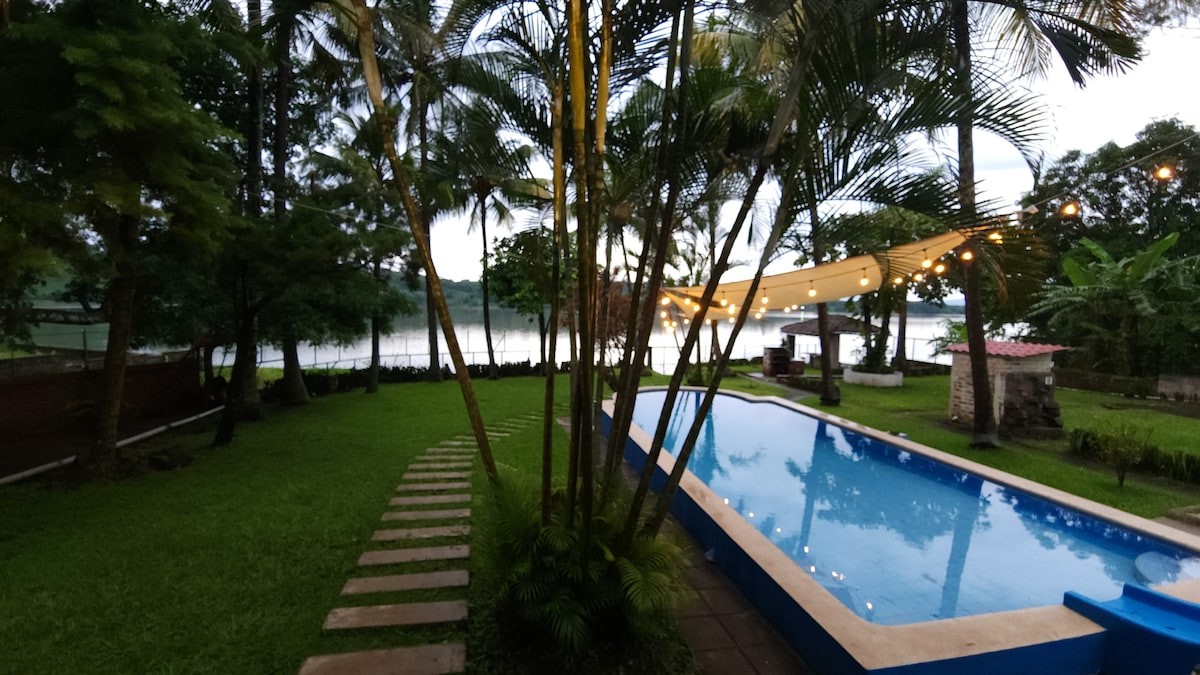 Hermosa y acogedora casa de campo en el lago de Coatepeque, rodeada de un ambiente natural, jardines y áreas verdes, una preciosa vista al lago y un ambiente fresco por el bosque que posee. Vista Turquesa se encuentra a 3 hrs del Aerop. de El Salvador, 1.30 min desde San Salv., 20 min de Santa Ana y a 15 min de la estación de gas e iglesia. El estilo de la casa es completamente moderno, se ha remodelado pensando en detalles que harán de su estadía memorables recuerdos con familia y amigos.