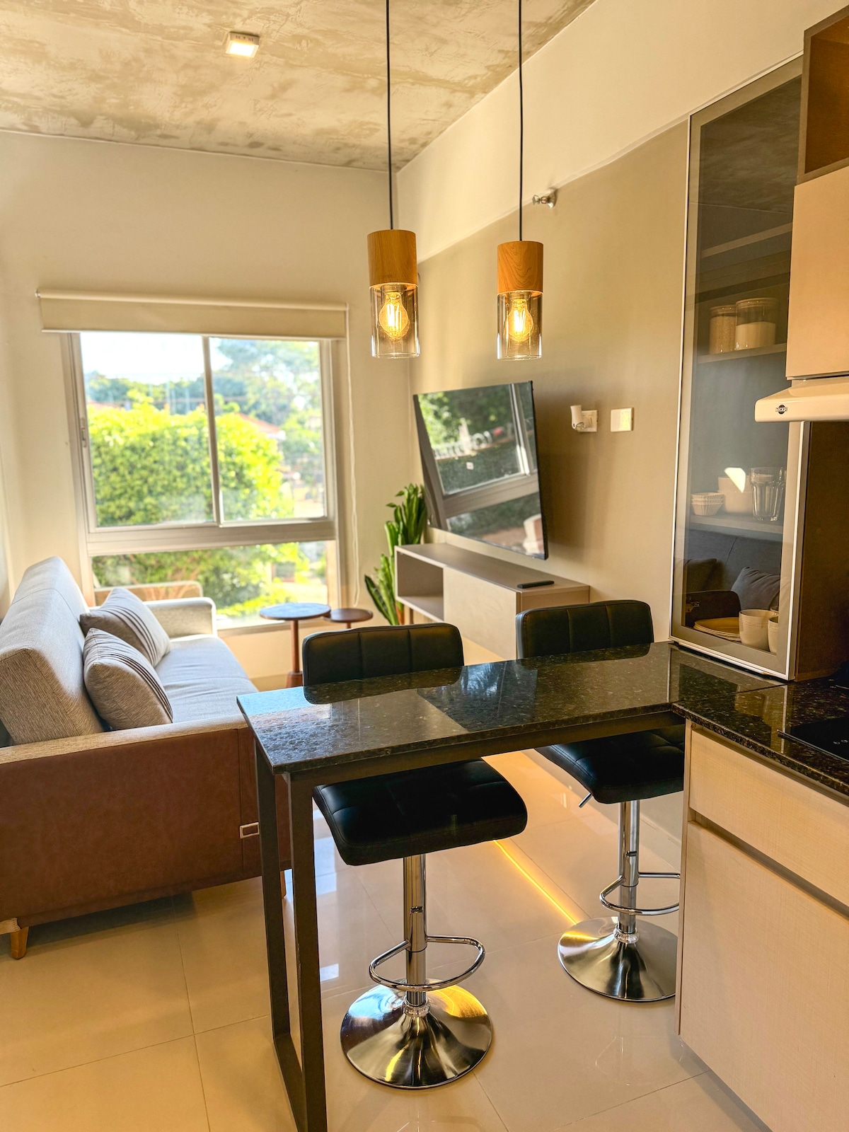 Monoambiente moderno, cómodo y con luz natural todo el día. Tiene balcón con vista abierta, ideal para relajarse o trabajar. Está bien ubicado, cerca de todo pero fuera del ruido del centro. El edificio ofrece pileta, gym, parrillero, sala de reuniones con proyector y TV, salón de cartas, sala de niños con TV y área de lavado con máquinas. Equipado con aire, Wi-Fi, smart TV, cocina completa y escritorio. Ideal para estadías cortas o largas. Permite alojar hasta 3 personas.
