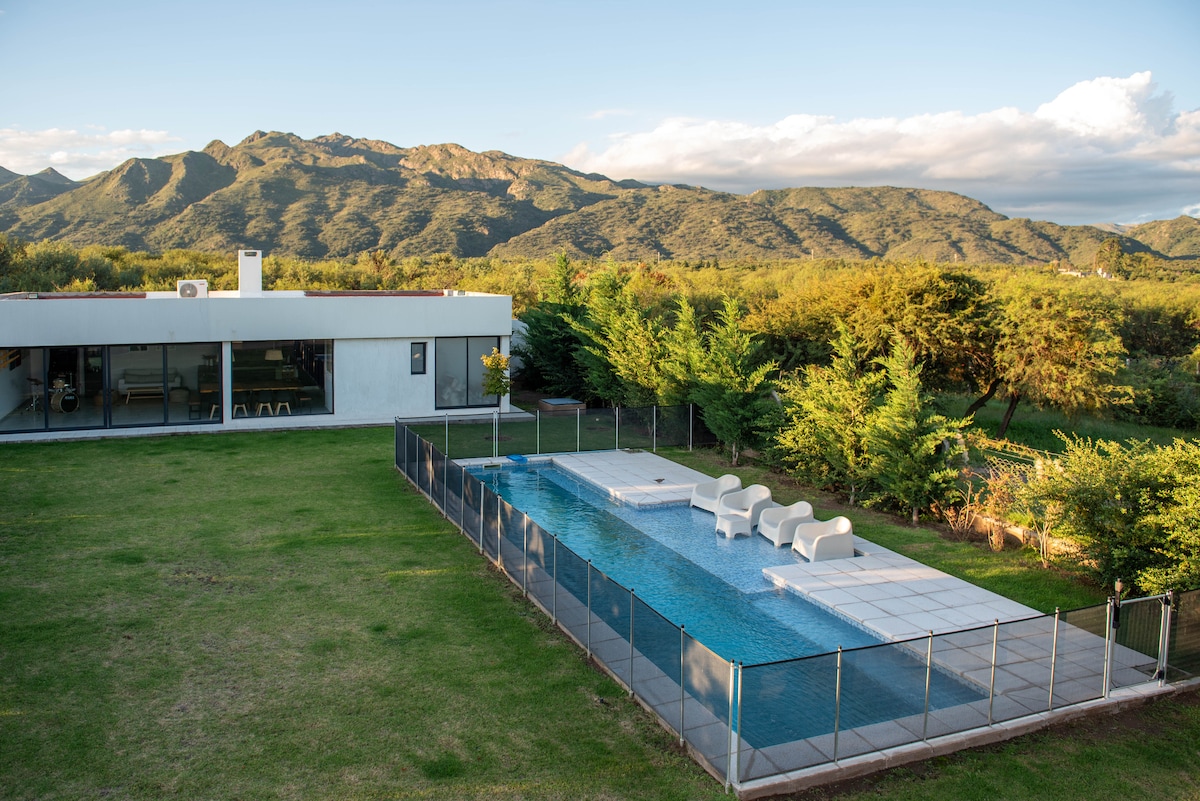 Pihenj ebben az egyedi és csendes szálláshelyben. Újonnan kiadott. Lenyűgöző kilátás Cerro Champaquíra. Tiszta nyugalom. 6,5 hektárnyi terület. A legjobb hely. A városnézés fele Könnyen megközelíthető. Őshonos hegyekkel körülvéve. 60mts. Akár 5 fő. 3 környezet. Liv-Com-Cooking with/salamander. Fürdőszoba. 2 alvás. Egy A/A Frio/Heat funkcióval. 2. háromszemélyes ágy, ventilátor és elektromos tűzhely. Felszerelt konyha. Terasz. Minden kifogástalan. Native garden and Mt.. Wifi és TV a chromecast segítségével. Grill/tűzrakóhely és diszkó