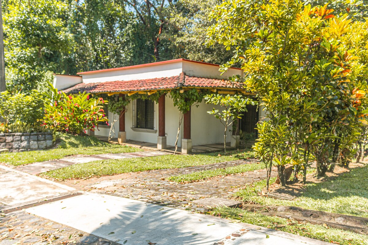 Casa de campo en la costa sur a cinco minutos del IRTRA, Retalhuleu. Lugar paradisíaco en un punto tropical con vegetación exuberante entre flores y canto de pájaros. Alejada del bullicio de la ciudad y el tráfico. Ideal para un completo descanso en familia o amigos. Piscina para adultos y para niños para refrescarse del agradable calor del lugar.