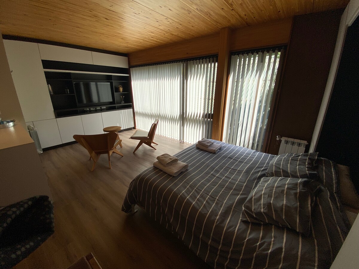 Központi mono környezet kialakítása , új , 32 m2 funkcionális bútorokkal, 1,60 x 1,90-es franciaágy, teljes fürdőszoba kabinnal és dupla zuhanyzóval. Teljesen felszerelt edények, turmixgép, gyümölcscentrifuga, elektromos vízforraló és kenyérpirító, hűtőszekrény fagyasztóval , tűzhellyel és gáztűzhellyel, mikrohullámú sütővel, tisztítószerrel. 43hüvelykes Full HD Smart TV: Netflix, WiFi, Fűtés radiátorral, meleg víz kazánnal, elektromos portás, Közös terület: Mosógép/szárítógép (ingyenes)és kültéri grillező
