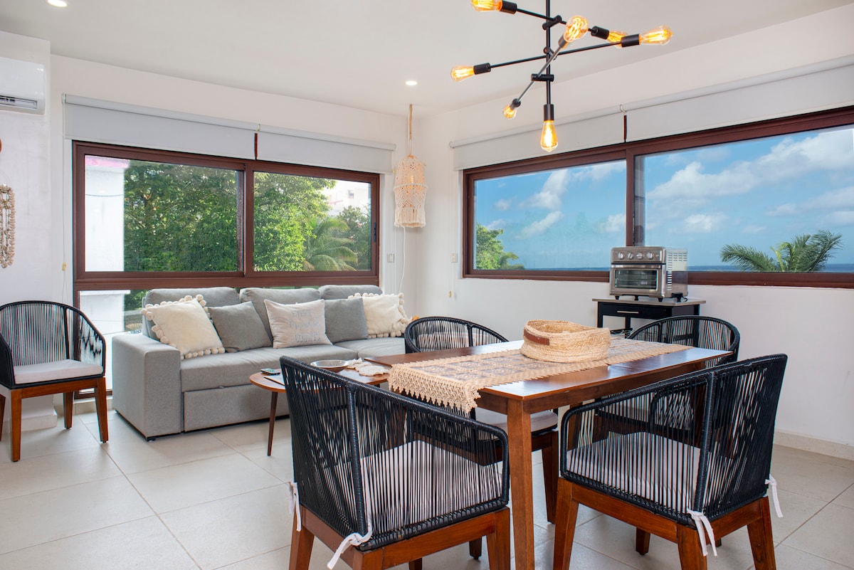 Menekülj luxus 2 hálószobás lakásunkba Cozumel szívében! Lenyűgöző teraszokkal, modern nappalival és kiváló minőségű kényelmi szolgáltatásokkal ez a lakás tökéletes hely a kikapcsolódásra és a sziget nyugalmának felszívására. Pihenj a síkképernyős TV előtt, vacsorázz a stílusos, hatszemélyes asztalnál, vagy készítsd el a saját ételeidet a teljesen felszerelt konyhában. Hangulatos hálószobáink Queen méretű ágyakkal, privát teraszokkal és fényűző ágyneművel büszkélkedhetnek a békés éjszakai alváshoz.