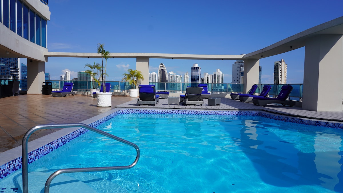 Vadonatúj lakás egy toronyházban Panama belvárosának közepén. Nagyon központi elhelyezkedésű. Két teljesen berendezett szoba és teljesen felszerelt konyha. Gyönyörű kilátás a városra és a Csendes-óceánra. A vendégek az épület minden kényelmi szolgáltatását használhatják, például a medencét, az edzőtermet, a közös munkaterületet és a játékszobát. 15 perc sétára van a Casco Viejótól. 5 perc sétára van a Mercado de Mariscostól, a Cinta Costeirától és az 5 de Mayo metróállomástól. Reptéri transzferszolgáltatás is elérhető.