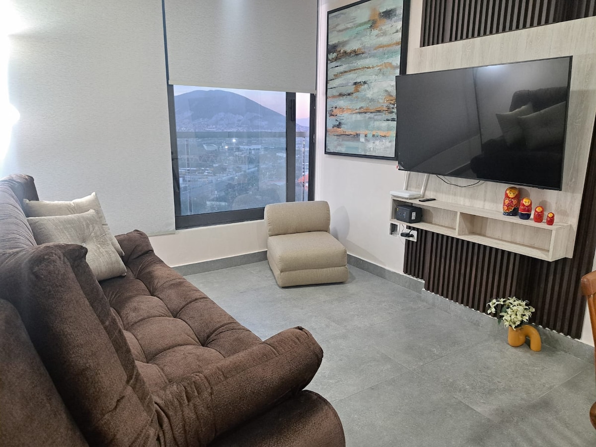 !A legjobb hely és Monterrey 360 fokos kilátás! Teljesen felújított luxus penthouse Alexa rendszerrel. 2 képernyő 65'' és 50" c/ Firestick (csatornák és események). Könnyen megközelíthető és biztonságos területen található. Kétszintes penthouse: Alsó rész: Konyha, étkező, társalgó kanapéággyal; ónix asztal; kandalló, fagyasztó, teljes fürdőszoba, TV és terasz (fotelek) Felső rész: hálószoba, queen méretű ágy, TV, minibár és íróasztal Medence, EDZŐTEREM és tárgyalóterem
