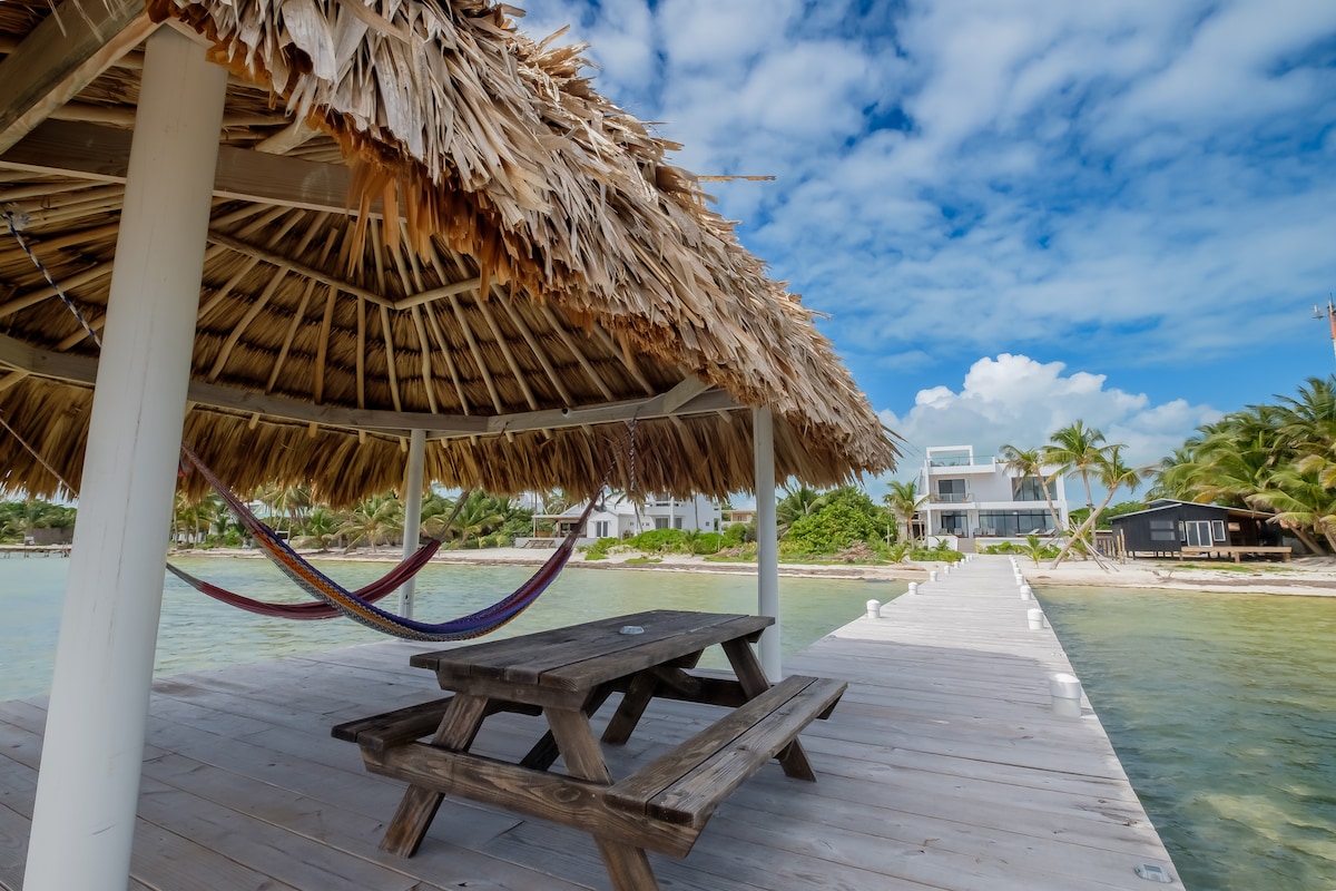Víz feletti kunyhó üvegpadlóval és saját medencével.