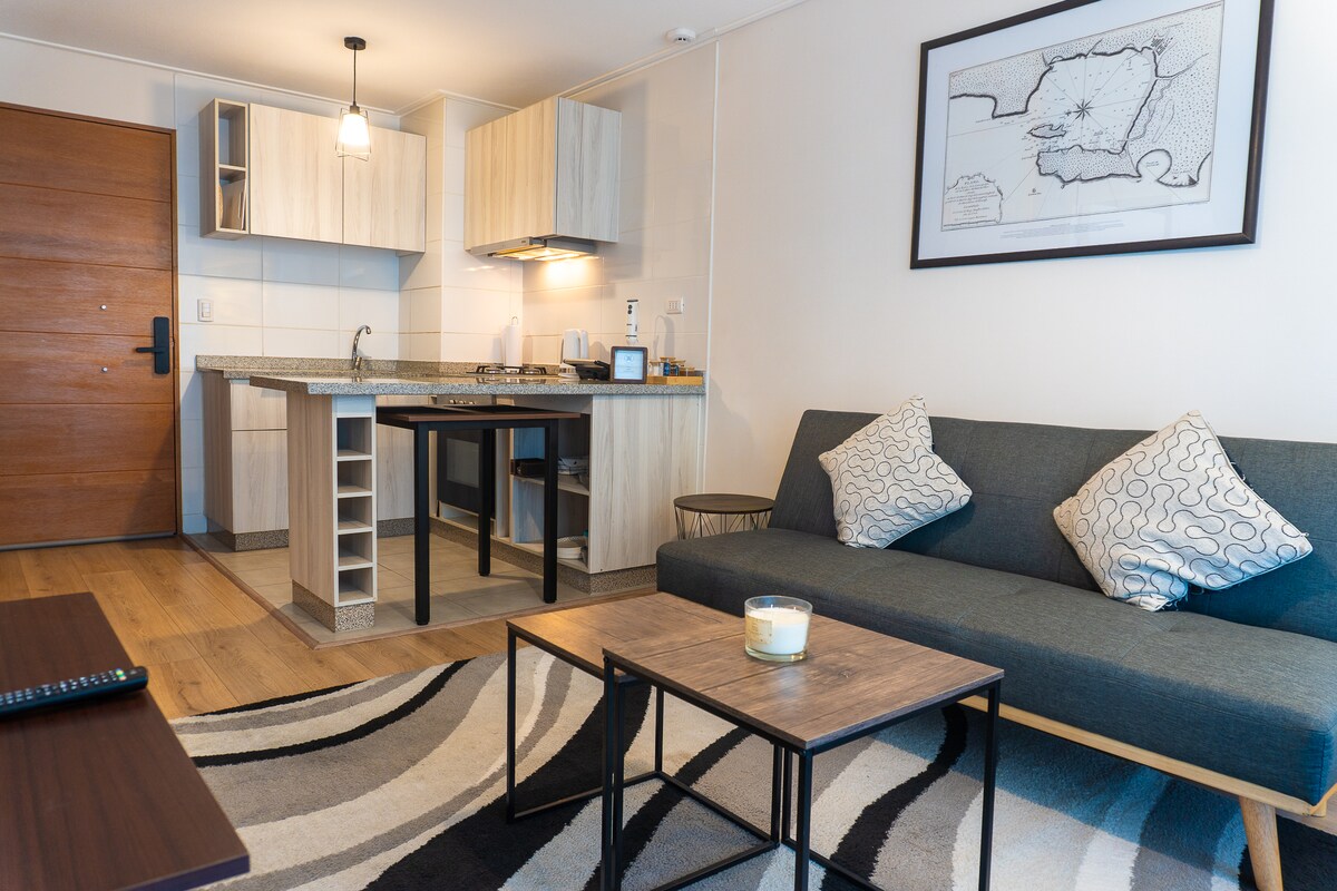 Disfruta de una experiencia con estilo en este alojamiento céntrico, cómodo y full equipado: - Ideal para 2personas - 1 cama queen + 1 futón - Wifi, SmartTV+3000canales(fútbol incluido)Netflix - Cocina full equipada. El edificio ofrece gimnasio y sala de cowork. A 3min del terminal, estadio, universidades, lavandería, farmacias y supermercados. Con locomoción a la puerta, conectividad ideal. Cuenta con conserjería 24/7. Perfecto para descansar, trabajar o explorar la ciudad.